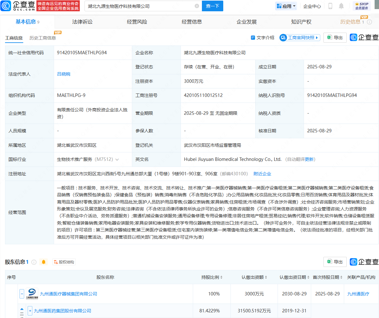 近日,湖北九源生物医疗科技有限公司成立,法定代表人为吕晓婉财富配资,注册资本为3000万元,经营范围包含:第一类医疗器械销售;保健食品(预包装)销售;通用设备修理;专用设备修理;非居住房地产租赁等。企查查股权穿透显示,该公司由九州通(600998)旗下九州通医疗器械集团有限公司全资持股。